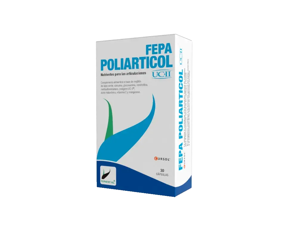 Complemento alimenticio a base de mejillón de labio verde, glucosamina, condroitina, MSM, vitamina C, ácido hialurónico, colágeno UCII, manganeso y cúrcuma para el mantenimiento de huesos y tejido conectivo. ¡Cuida tus articulaciones con FEPA POLIARTICOL!