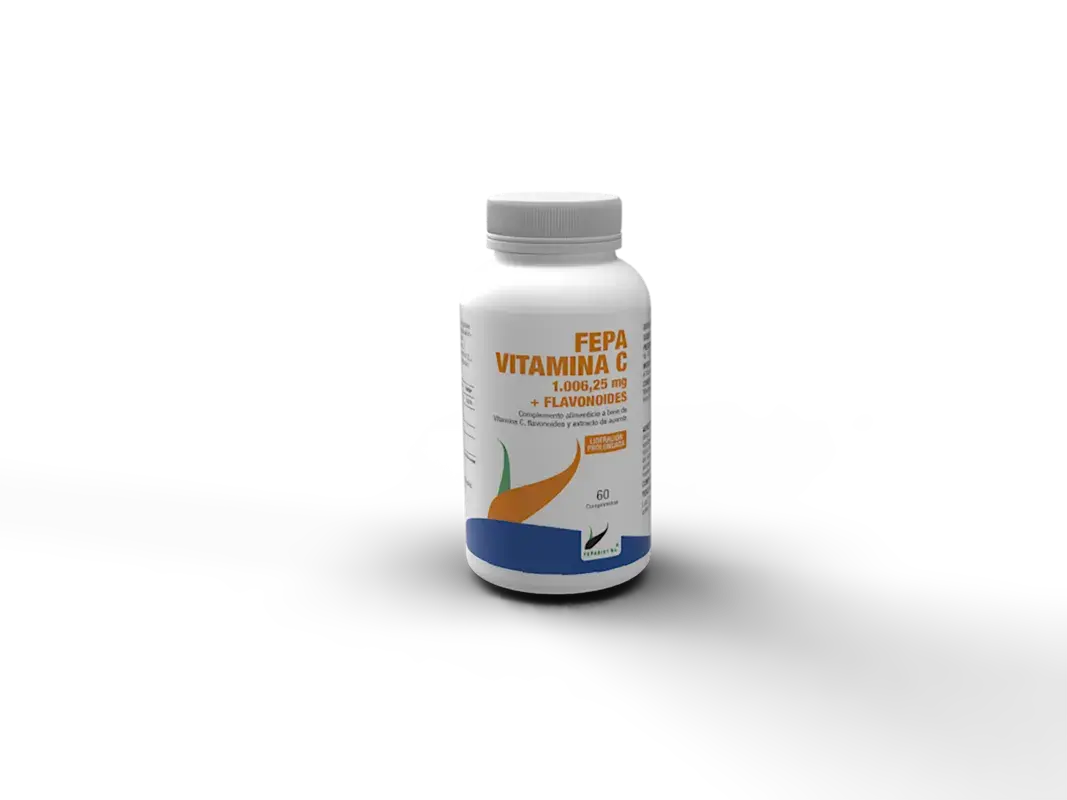 FEPA VITAMINA C + Bioflavonoides es un complemento alimenticio que combina vitamina C, flavonoides y extracto de acerola. La vitamina C promueve el funcionamiento normal del sistema inmunitario, especialmente durante y después del ejercicio físico intenso. Además, contribuye a la formación de colágeno para mantener la salud de huesos, cartílagos, encías, piel y dientes. Cada comprimido aporta 1000 mg de vitamina C, junto con otros nutrientes como acerola, hesperidina y rutina. Este producto se presenta en envases de 60 comprimidos de 1600 mg y se recomienda ingerir un comprimido al día con abundante agua.